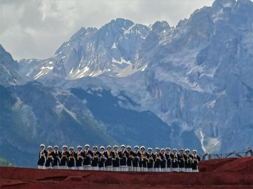 Met het besneeuwde berglandschap van Jade Snow Dragon Mountain als achtergrond, brengen 100-den acteurs, zangers en dansers de geschiedenis van de antieke thee-paardenroute tijdens de Lijang Impression Show.